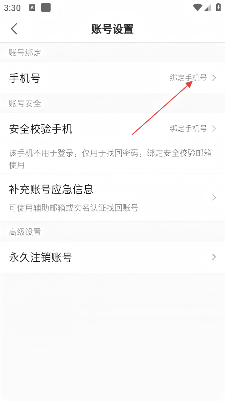 4、在账号设置页面,点击【手机号】右侧的【绑定手机号】,按照提示完成手机号绑定操作。