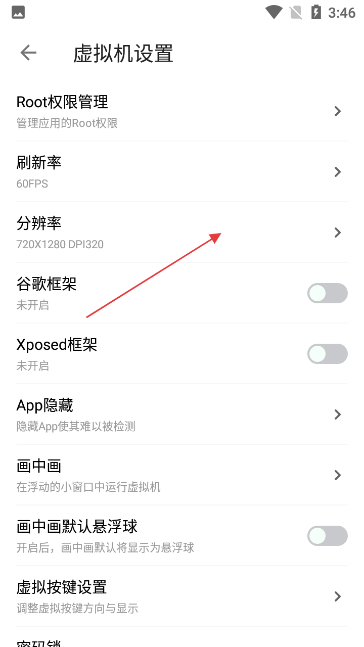 3、在虚拟机设置页面,点击【分辨率】选项,可进入分辨率设置页面。
