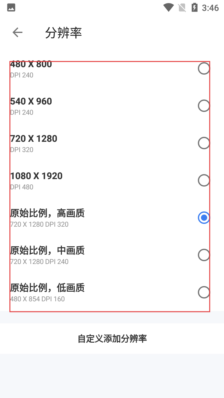 4、在分辨率设置页面,可选择多种分辨率选项,如480X800、720X1280等,也可自定义添加分辨率。