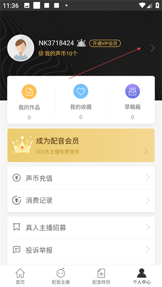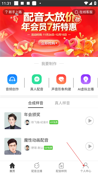 1、在首页点击底部【个人中心】,可进入个人功能页,首页还提供音频创作、真人配音等制作入口及样音资源。