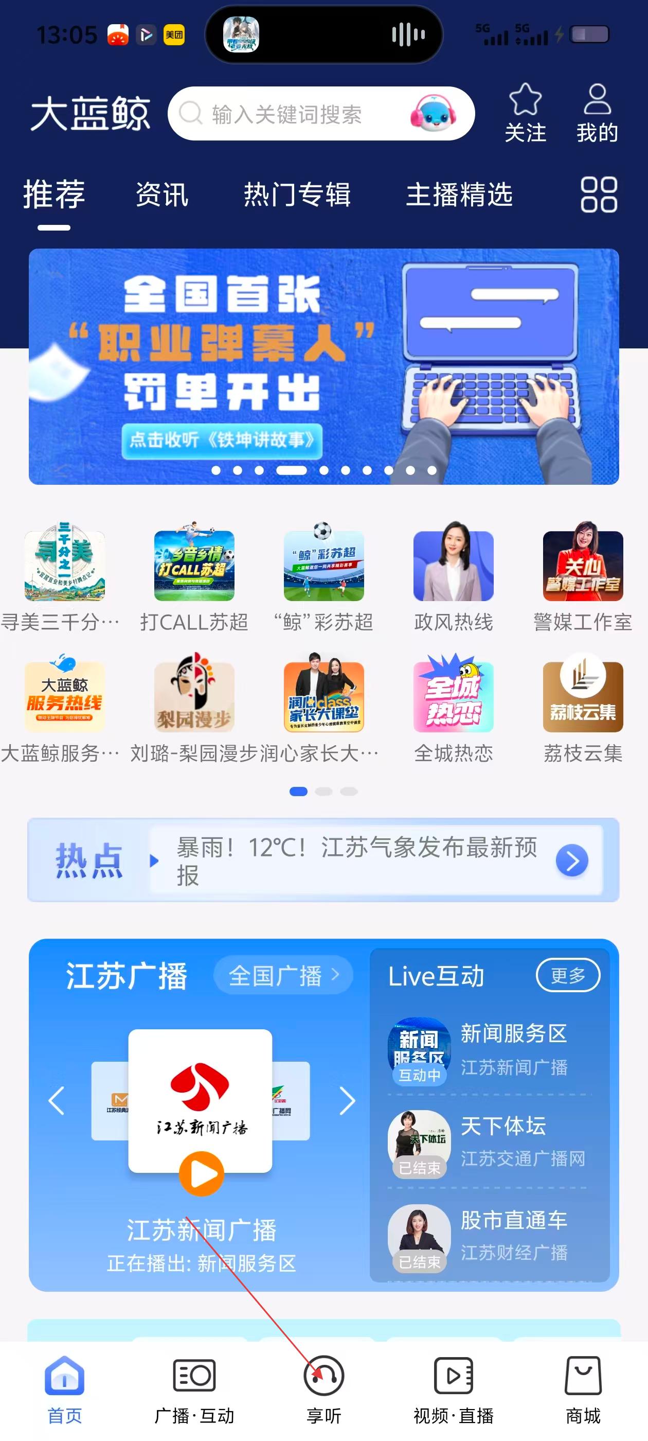 1、进入大蓝鲸APP首页,能看到各类推荐内容,若想收听音频内容,点击底部【享听】选项。