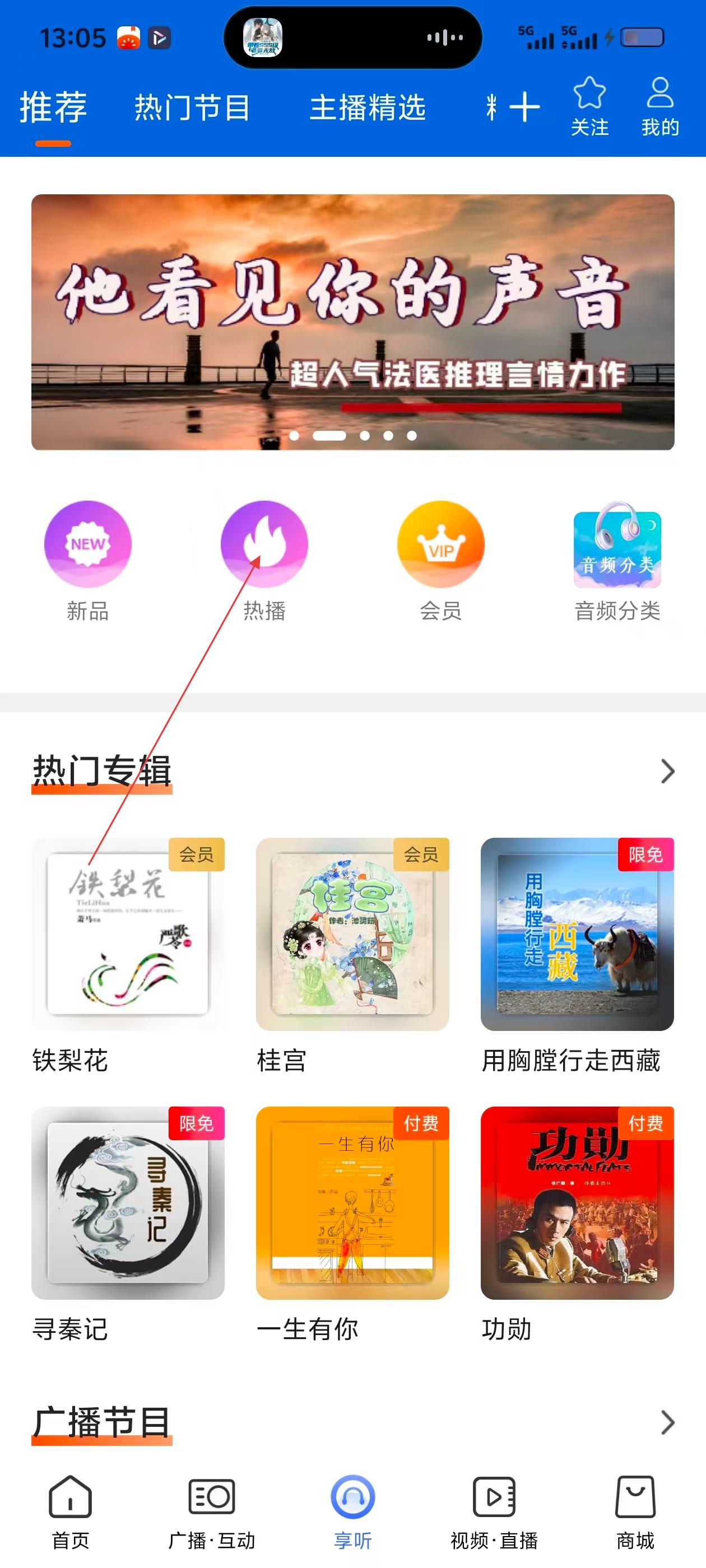 2、在享听页面,有【新品】【热播】等分类,若想了解热播音频,点击【热播】分类图标。