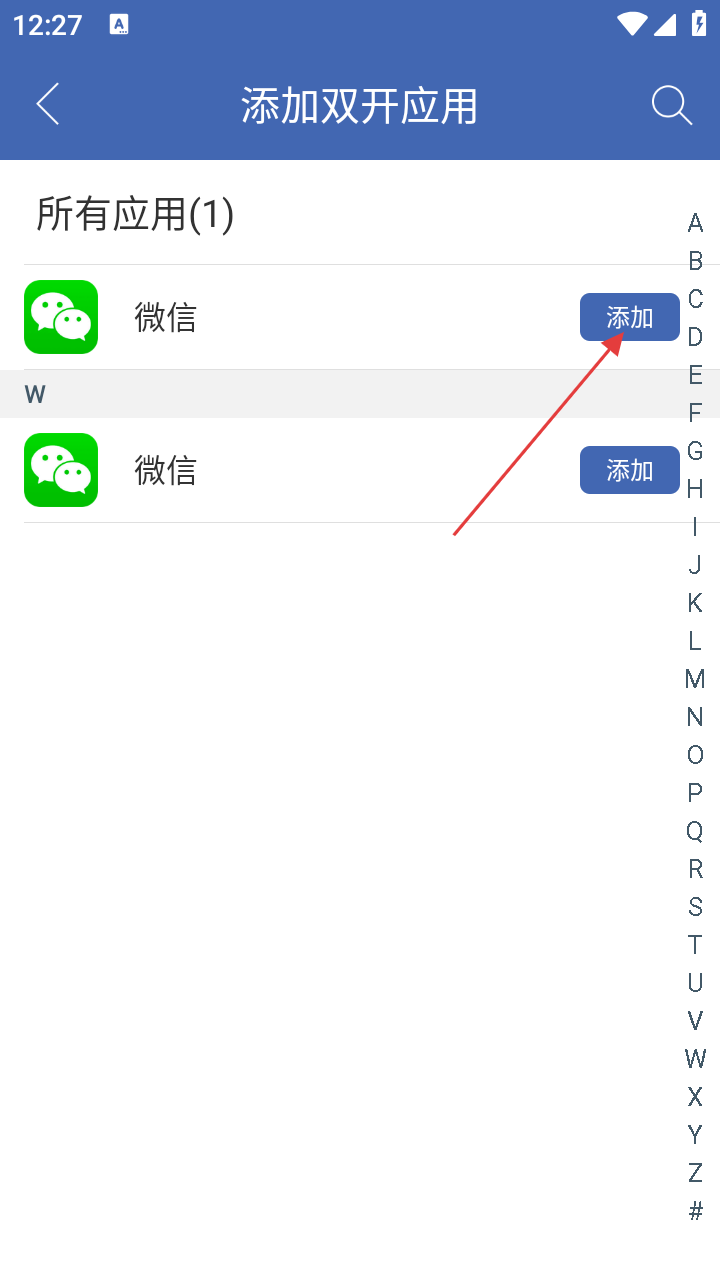 4、进入添加双开应用页面,若要添加应用锁,点击微信旁的【添加】按钮。