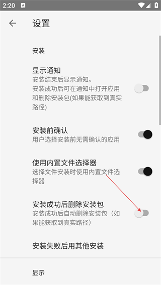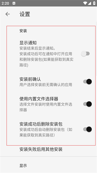 4、还可根据需求调整【显示通知】【安装前确认】【使用内置文件选择器】等设置,优化安装体验。