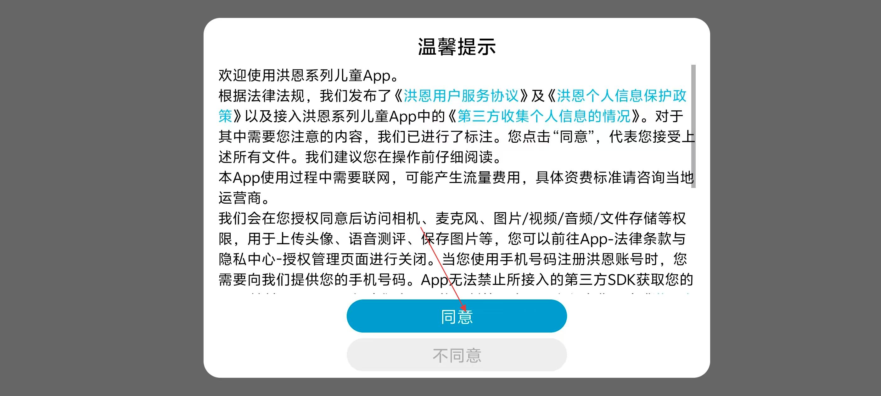 1、使用洪恩思维前,需阅读《洪恩用户服务协议》《洪恩个人信息保护政策》等,点击【同意】方可使用。