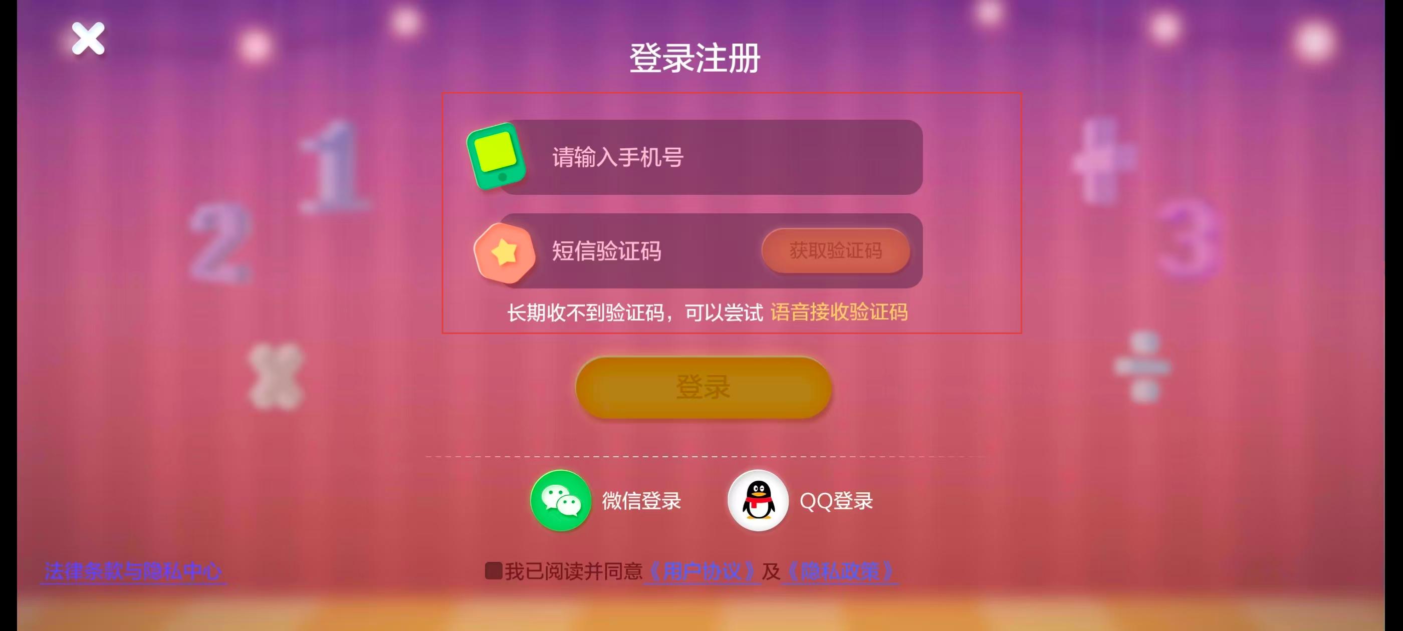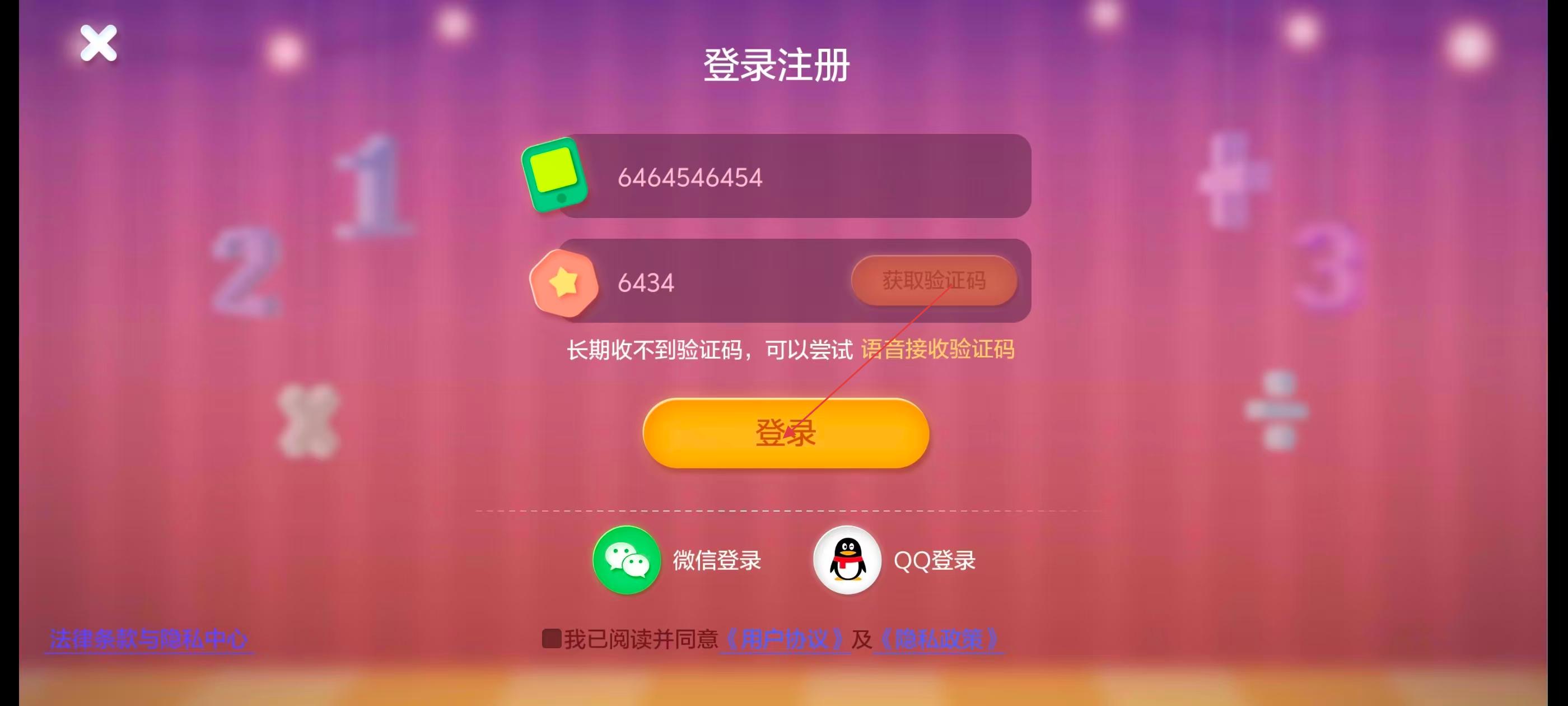 4、填写好手机号和验证码,勾选同意协议后,点击【登录】即可完成登录,未注册手机号将自动注册账号,方便使用APP的数学启蒙等功能。