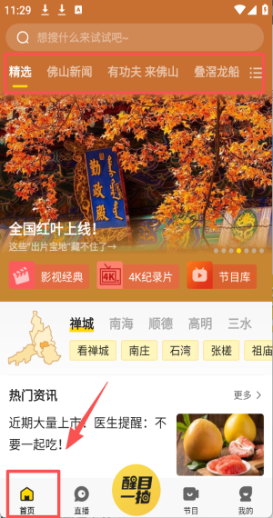 1、在首页点击“精选”或“佛山新闻”等标签,浏览相关内容。
