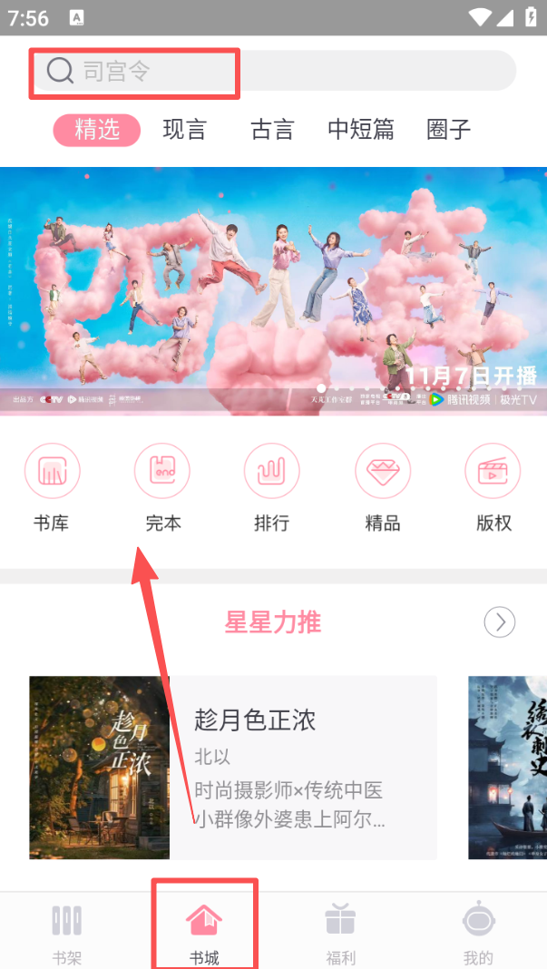 1、进入书城页面,点击顶部搜索框输入内容,可查找作品,也能通过 “完本”“排行” 等板块筛选内容。