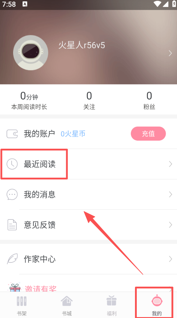 3、切换到 “我的” 页面,在 “最近阅读” 板块,能查看之前浏览过的作品,快速回到阅读进度。