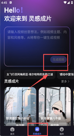 2、在首页点击AI成片输入视频主题让AI自动生成完整视频。