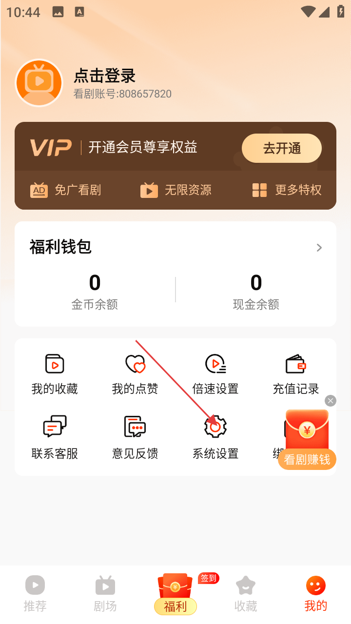 2、在【我的】页面,可看到看剧账号等,若要进行系统相关设置,点击【系统设置】选项。
