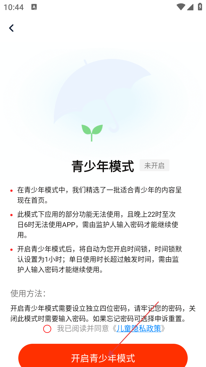 4、进入【青少年模式】页面,阅读相关说明后,勾选同意《儿童隐私政策》,点击【开启青少年模式】按钮即可开启。