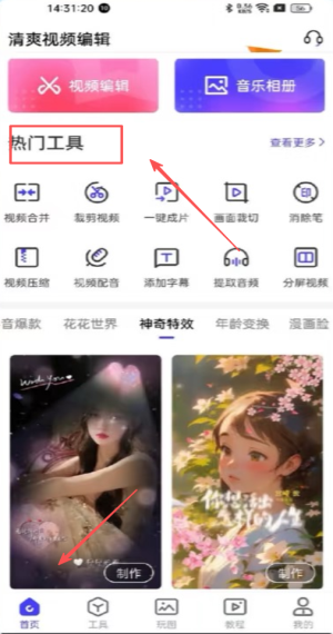 1、打开清爽视频编辑器,在首页“热门工具”里点“一键成片”进入创作。