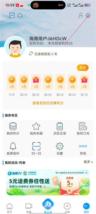 1、打开【海博TV】后,点击底部【我的】进入个人中心,可查看账号积分、签到任务及服务功能入口。