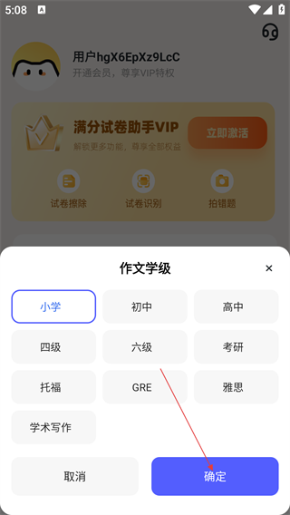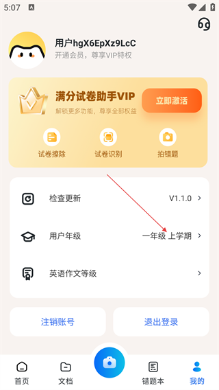 2、进入个人中心后,点击【用户年级】选项,可进入年级选择页面,调整适配的学习年级。