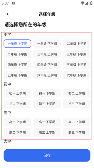 4、选好目标年级(如【一年级-下学期】)后,点击底部【保存】按钮,即可完成年级设置并生效。