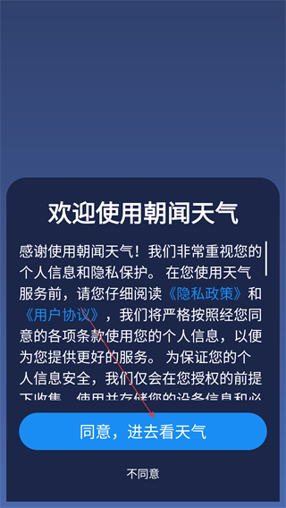 1、打开APP后,阅读《隐私政策》和《用户协议》,点击【同意,进去看天气】按钮进入主界面。