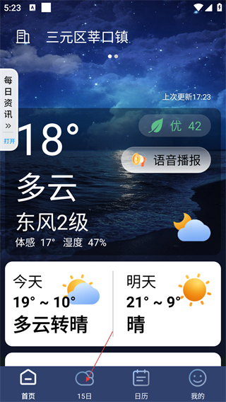 2、在主界面点击底部导航栏的【15日】选项,进入15日天气预报界面。