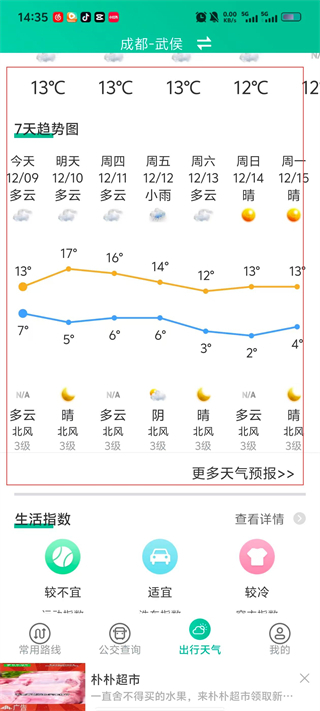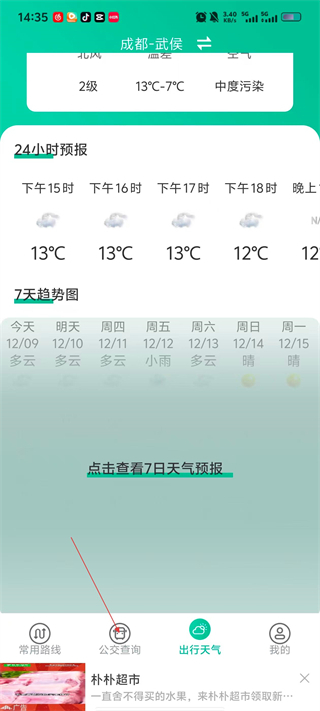 3、在天气页面,可直接查看当前城市(如成都-武侯)的实时天气、24小时预报及7天趋势图。
