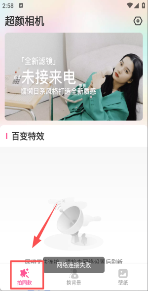 2、进入首页点“拍同款”,选“慵懒日系”滤镜,若网络失败则点“刷新”重连。