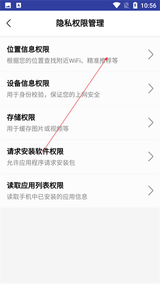 3、在隐私权限管理界面,查看各类权限(如位置信息权、存储权等),点击目标权限。