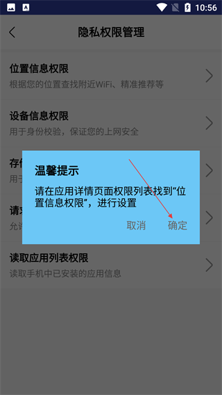 4、在弹出的“温馨提示”中点击“确定”,跳转至应用详情页完成权限配置。