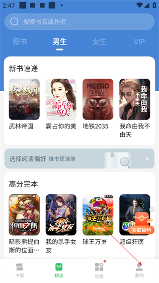 1、进入阅读应用精选页,可浏览【新书速递】【高分完本】等板块书籍,点击底部【我的】进入个人中心。