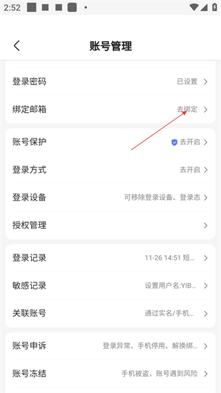 4、在账号管理页面,点击【绑定邮箱】,即可进入绑定邮箱流程进行绑定。