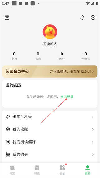 2、在个人中心,可查看书豆、书券等资产,点击【点击登录】可进入登录界面,登录后可生成阅历并使用更多功能。