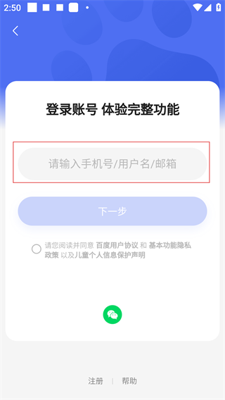 3、在登录界面,可输入手机号/用户名/邮箱,也可勾选协议后用微信登录,输入信息后点击【下一步】继续登录流程。