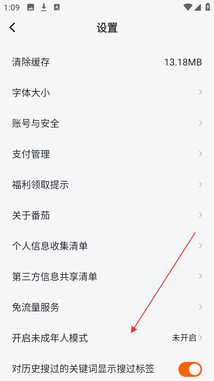 3、在设置页面,有【清除缓存】【字体大小】等选项,点击【开启未成年人模式】,可进入其介绍页面。