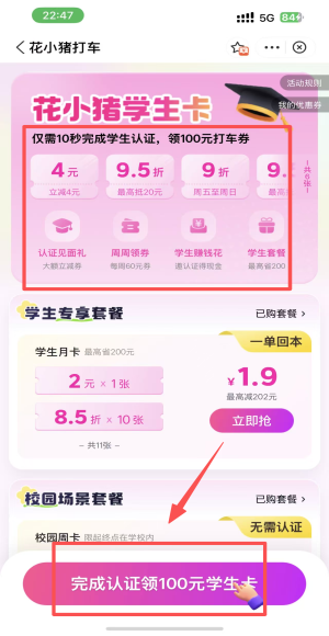 3、进入花小猪打车专享页面,完成学生认证领取优惠。