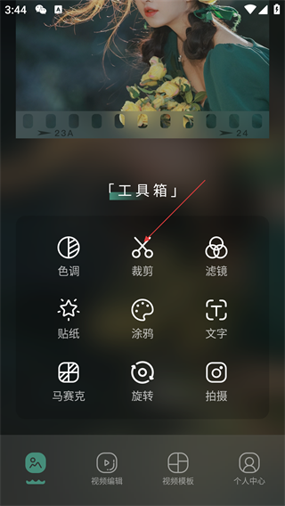 1、进入图片编辑工具的工具箱界面,选择【裁剪】功能,进入裁剪操作流程。