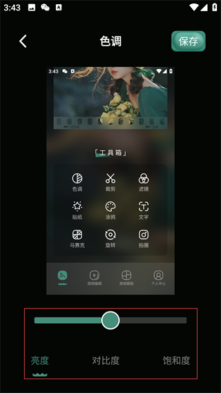 3、在色调调整界面,通过滑块调整图片的亮度、对比度、饱和度等参数,完成画面色彩优化。