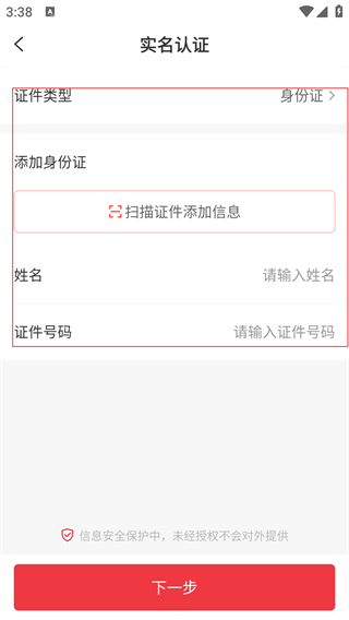 4、在【巴乐兔】实名认证界面,选择证件类型为身份证,可扫描证件或手动输入姓名、证件号码,完成后点击【下一步】即可。