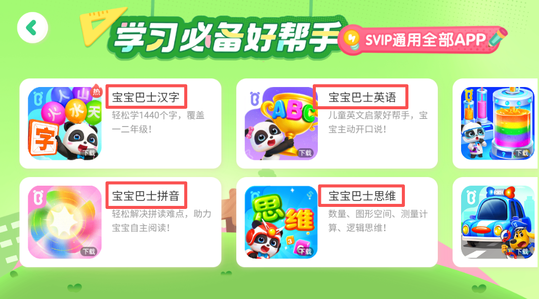 1、点击学习乐园,可进入学习必备好帮手页面,查看宝宝巴士汉字、英语等多款学习应用。