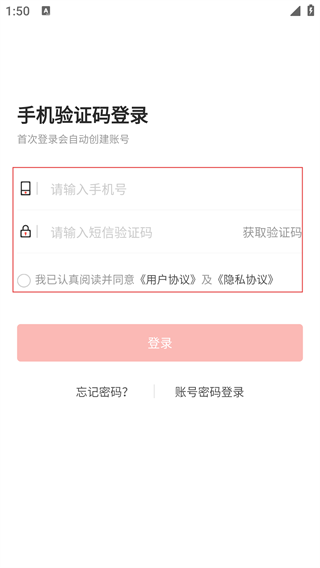4、在手机验证码登录页面,输入手机号、获取并填写短信验证码,勾选协议后点击【登录】,完成账号登录。