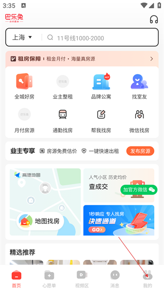 1、在【巴乐兔】首页,可选择上海等城市,搜索租房条件,有全城好房、品牌公寓等功能入口,点击【我的】可进入个人界面。