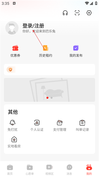 2、进入【巴乐兔】个人界面后,点击【登录/注册】按钮,可查看优惠券、历史租约等信息,进行个人租房相关管理。