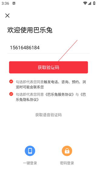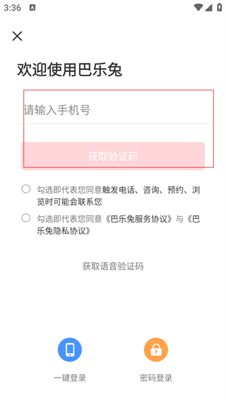3、在【巴乐兔】登录界面,需输入手机号,勾选同意相关条款后获取验证码,也可选择一键登录或密码登录。