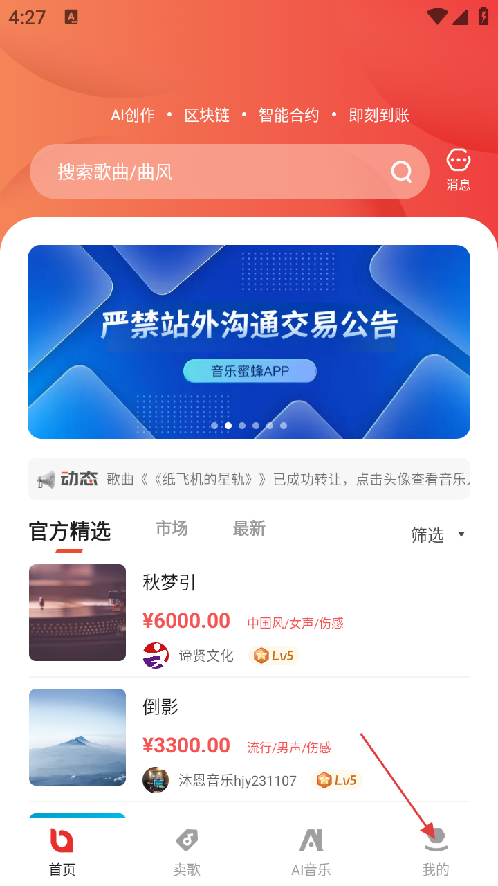 1、在音乐蜜蜂首页,若要进入个人相关页面,点击右下角【我的】选项。