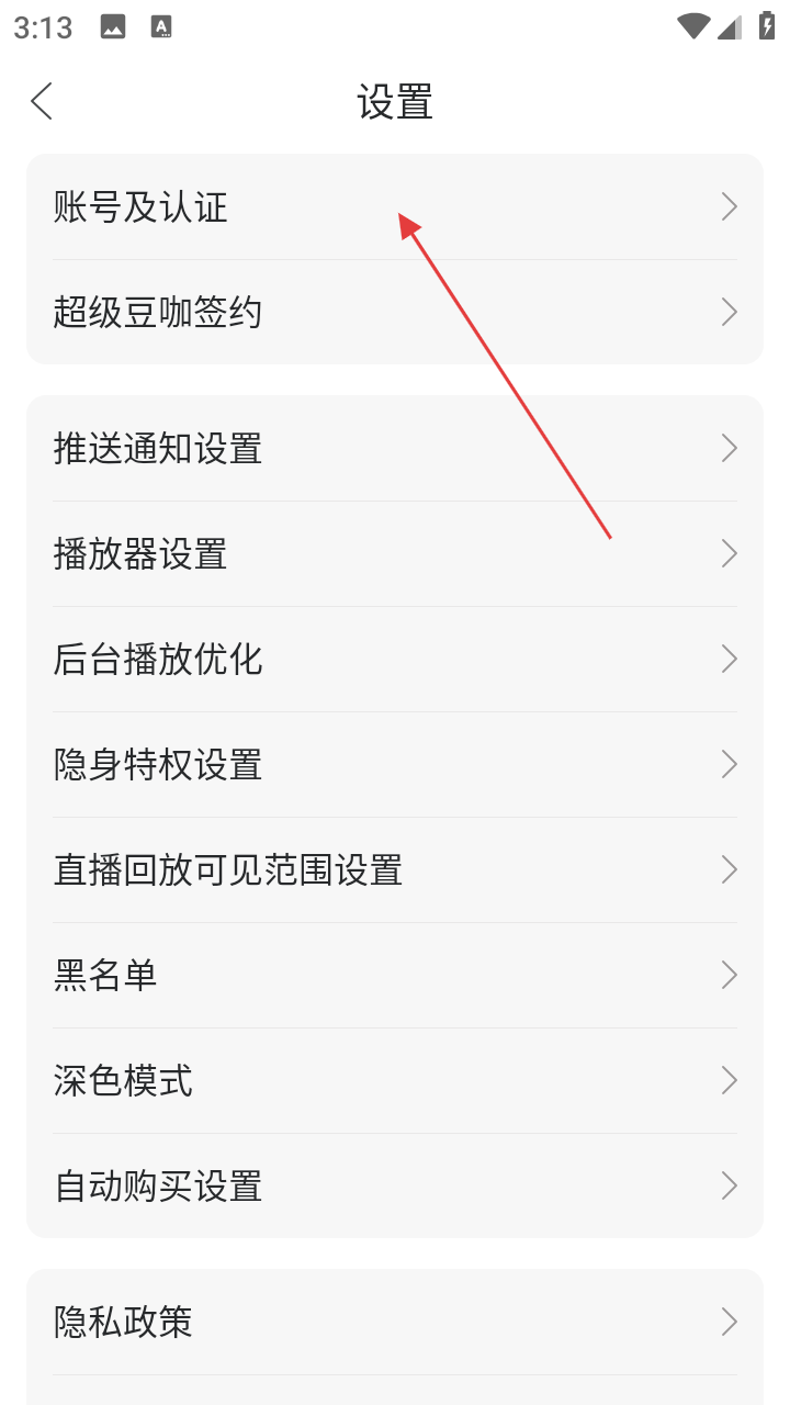 3、在设置界面,点击【账号及认证】进入账号及认证页面,还能对推送通知设置、播放器设置、后台播放优化等进行设置。