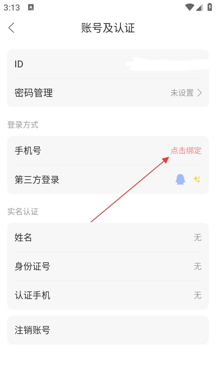 4、在账号及认证页面,点击手机号后的【点击绑定】,按照提示完成手机号绑定,还能进行密码管理、第三方登录绑定、实名认证等操作。