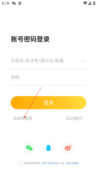 2、在账号密码登录页面,点击【验证码登录】选项,切换至验证码登录界面。