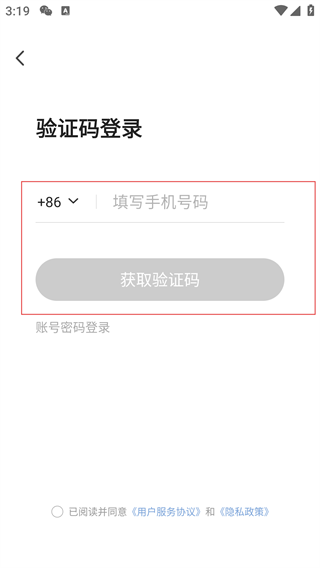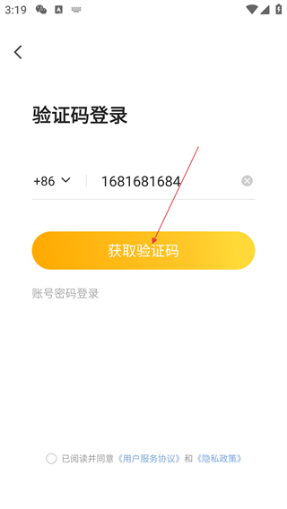 4、输入手机号后,勾选协议并点击【获取验证码】,填入收到的短信验证码,即可完成登录操作。