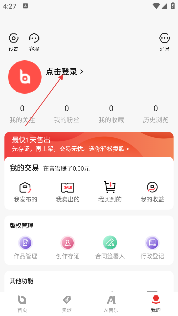 2、进入【我的】页面后,若要登录账号,点击【点击登录】区域。