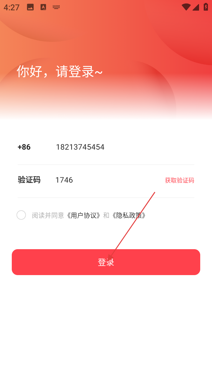4、完成手机号和验证码输入,勾选协议后,点击红色【登录】按钮即可登录。