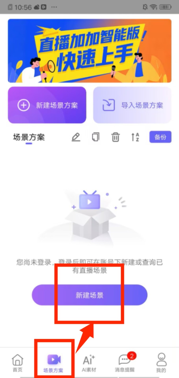 2、切换到 “场景方案” 页面,点击 “新建场景”,可创建或导入适配直播的场景配置方案。