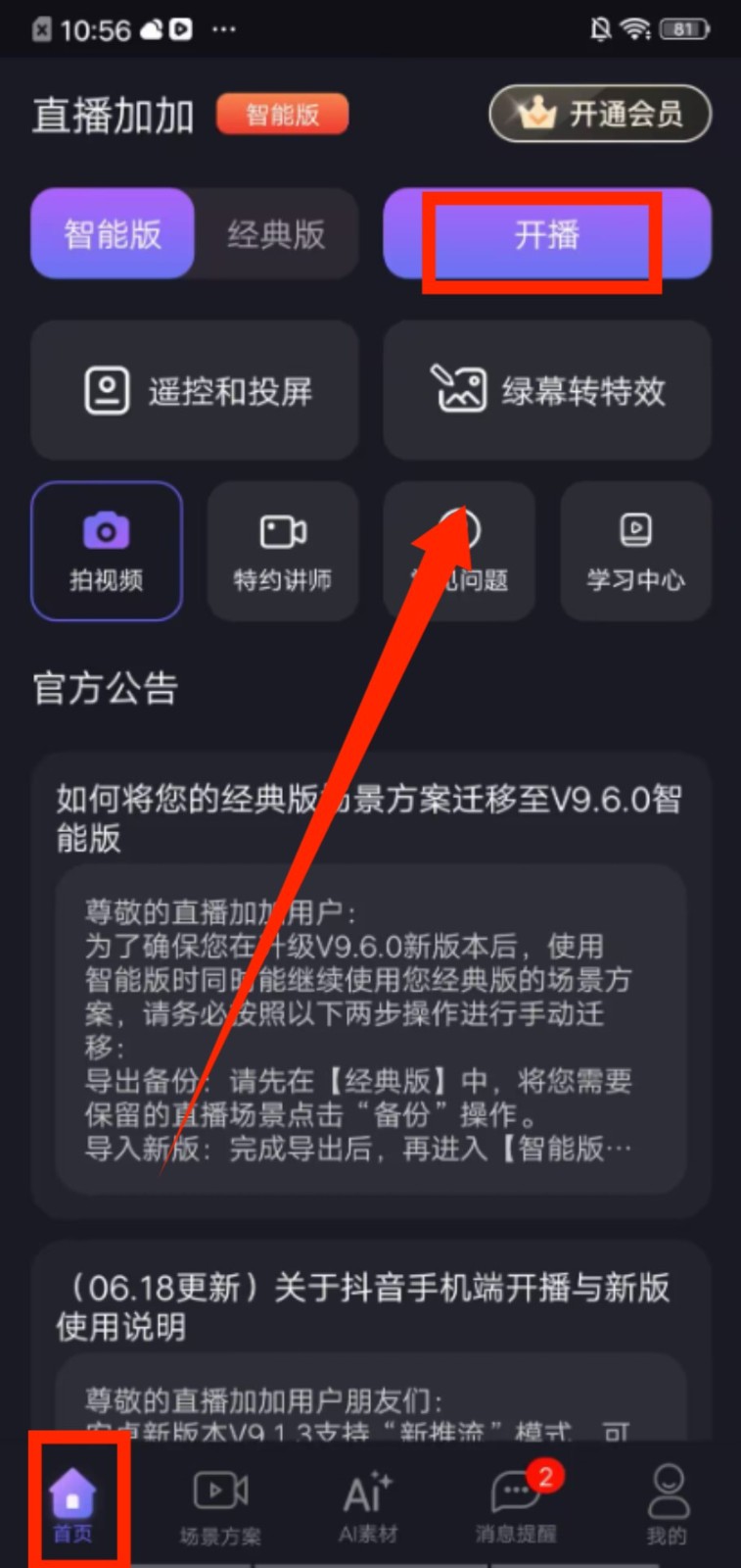 1、进入首页,点击右上角 “开播” 按钮,可开启直播相关操作,也能使用遥控投屏、绿幕特效等功能。
