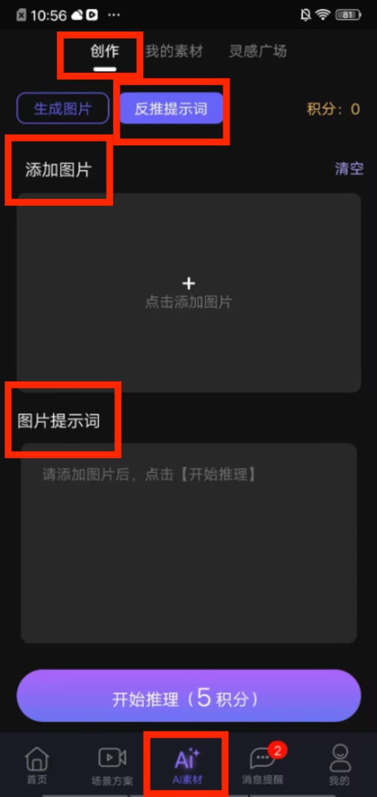 3、进入 “AI 素材” 板块,在创作栏下添加图片,使用反推提示词功能生成对应的图片提示词。